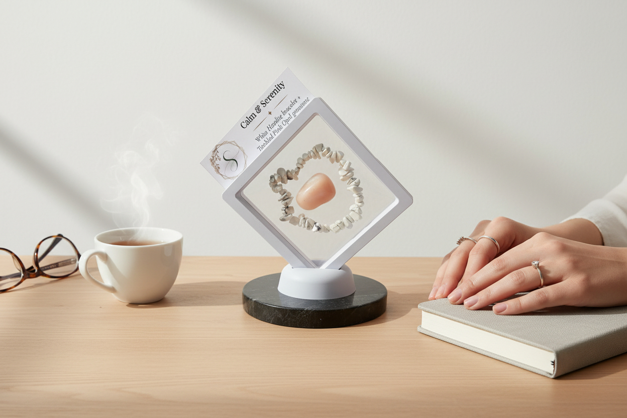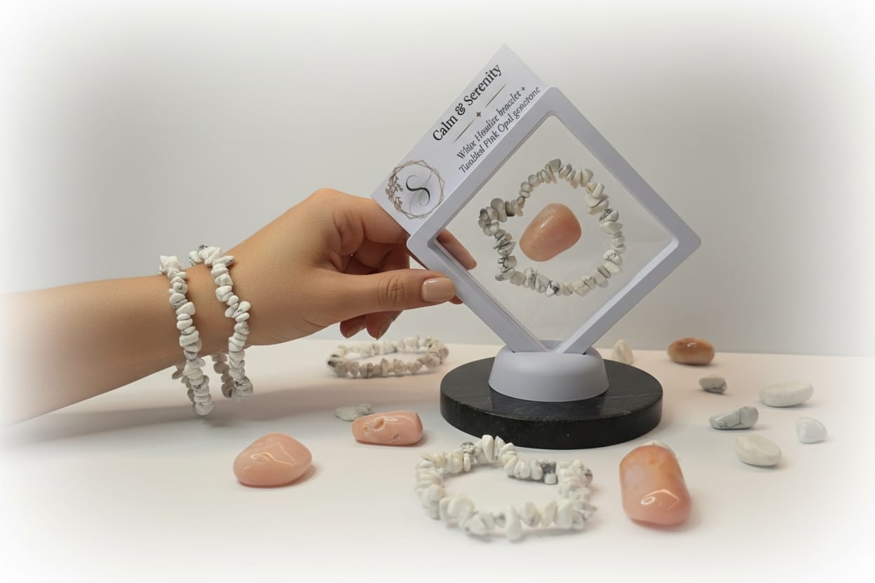White Howlite and Pink Opal create a deeply soothing and supportive energy. White Howlite calms the mind and quiets mental noise, while Pink Opal nurtures the heart and softens emotional tension. Together, they encourage serenity, emotional balance, and a sense of inner safety.