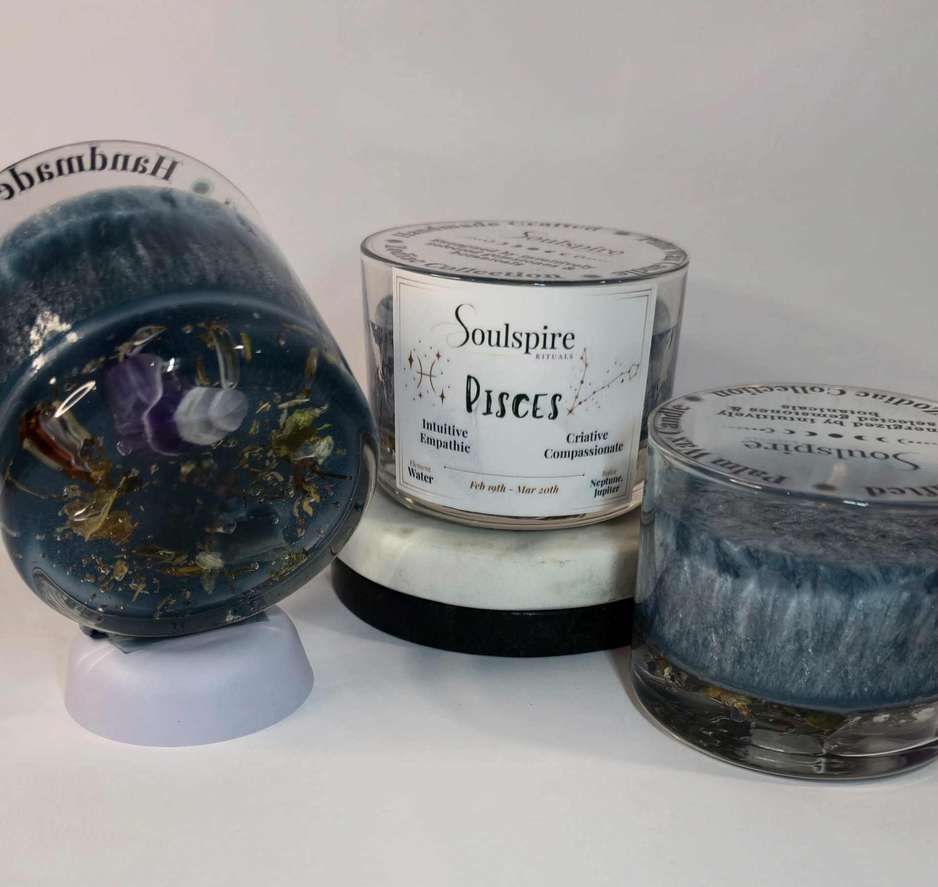 Each element of this candle was intentionally selected to attract and amplify the very best that Pisces has to offer. Crystals, herbs, color, and fragrance were chosen based on their energetic properties, working together as a unified composition.