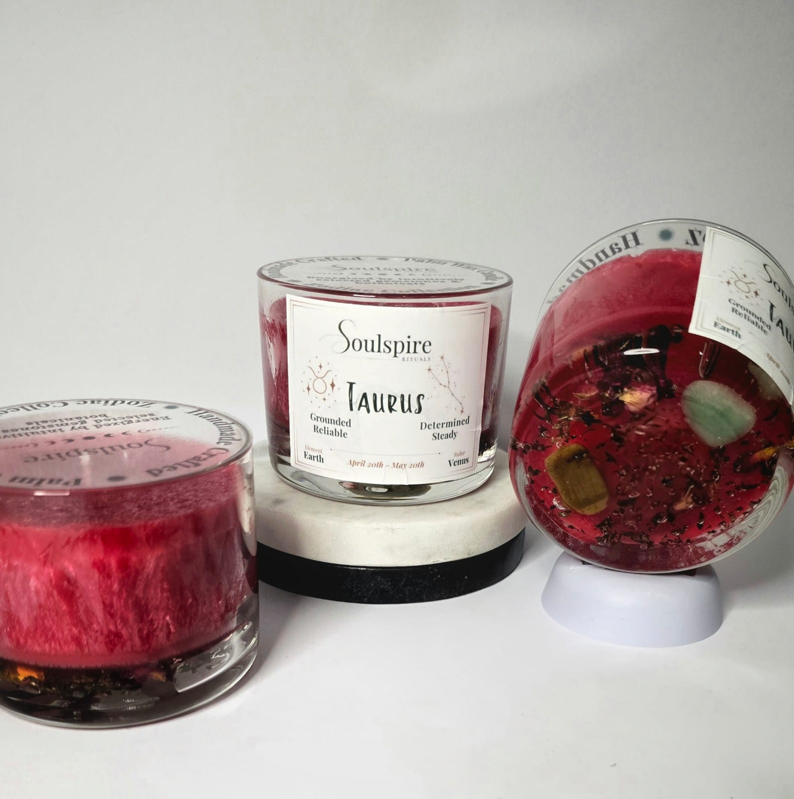 Each element of this candle was intentionally selected to attract and amplify the very best that Taurus has to offer. Crystals, herbs, color, and fragrance were chosen based on their energetic properties, working together as a unified composition.