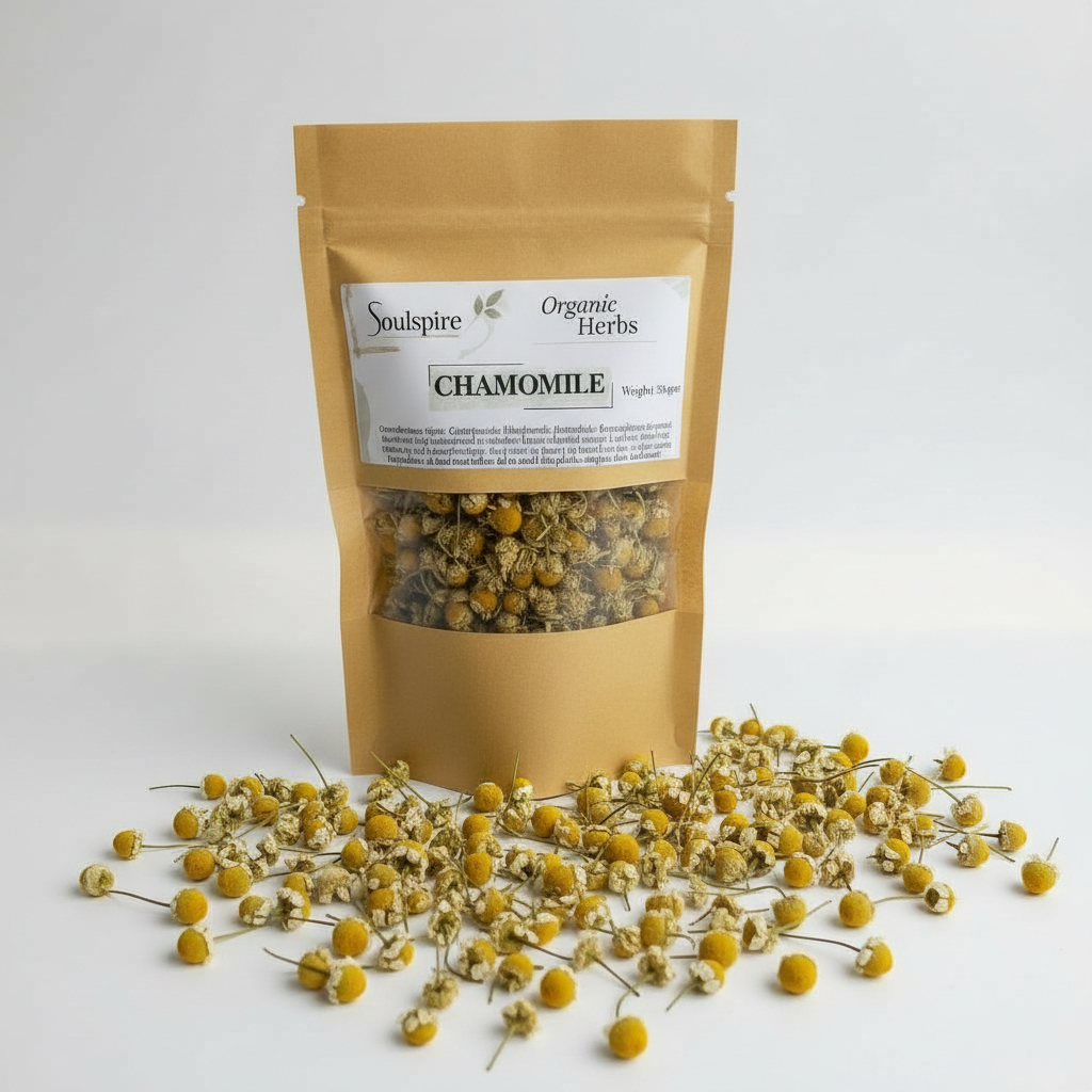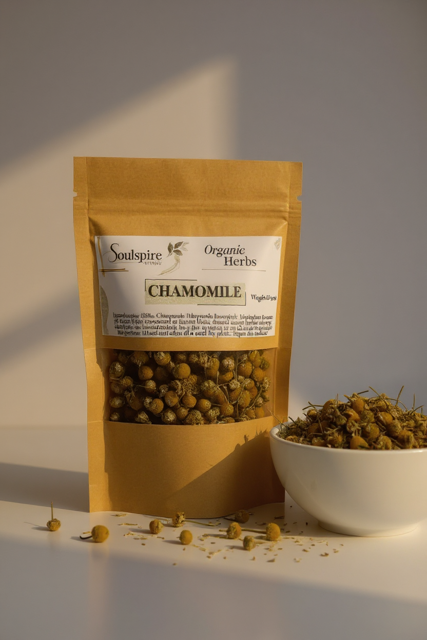 Chamomile (Matricaria chamomilla) is traditionally used to support digestive comfort, helping to relieve inflammation, colic, indigestion, nausea, mild diarrhea, headaches, and stomach discomfort. It is known for its calming effect, which may help regulate sleep and reduce nervousness, and is often used as a gentle intestinal tonic. When applied externally, it can help soothe skin irritations such as eczema.