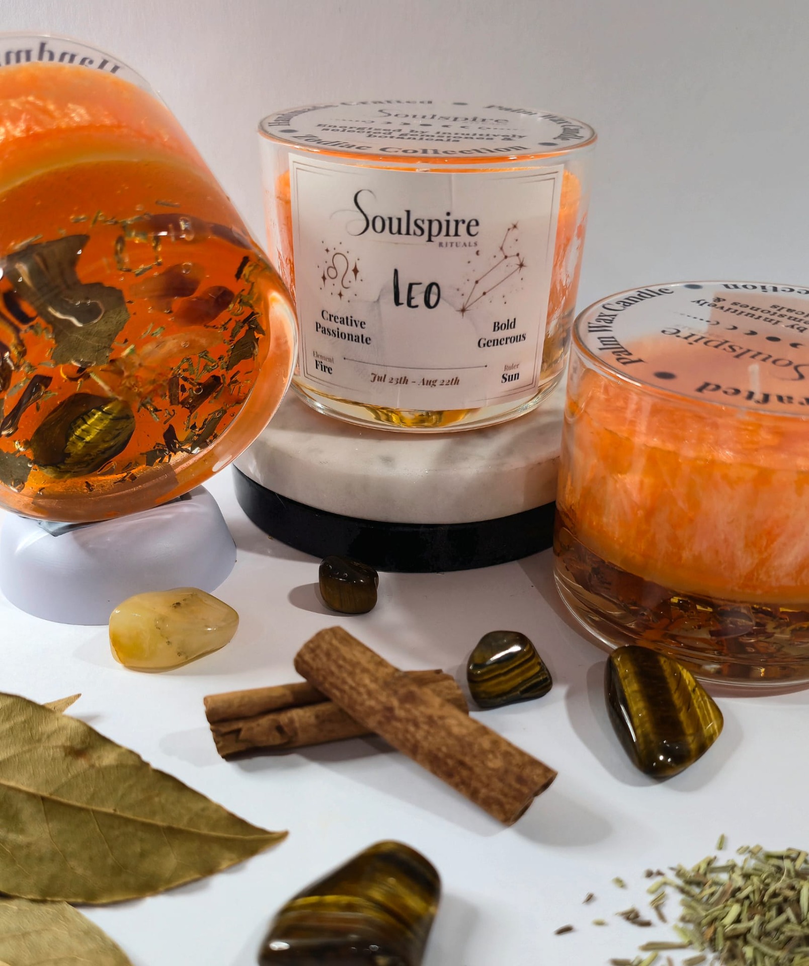 Created to reflect Leo's creative and radiant energy, this candle embodies confidence, passion, and bold self-expression. The transparent jelly wax base reveals Tiger's Eye, Carnelian, and a warm botanical blend of Cinnamon Sticks, Bay Leaf, and Rosemary, allowing their energetic presence to remain visible throughout the burn. Together, these elements support vitality, courage, and generous leadership, aligning with Leo's natural ability to inspire and shine.