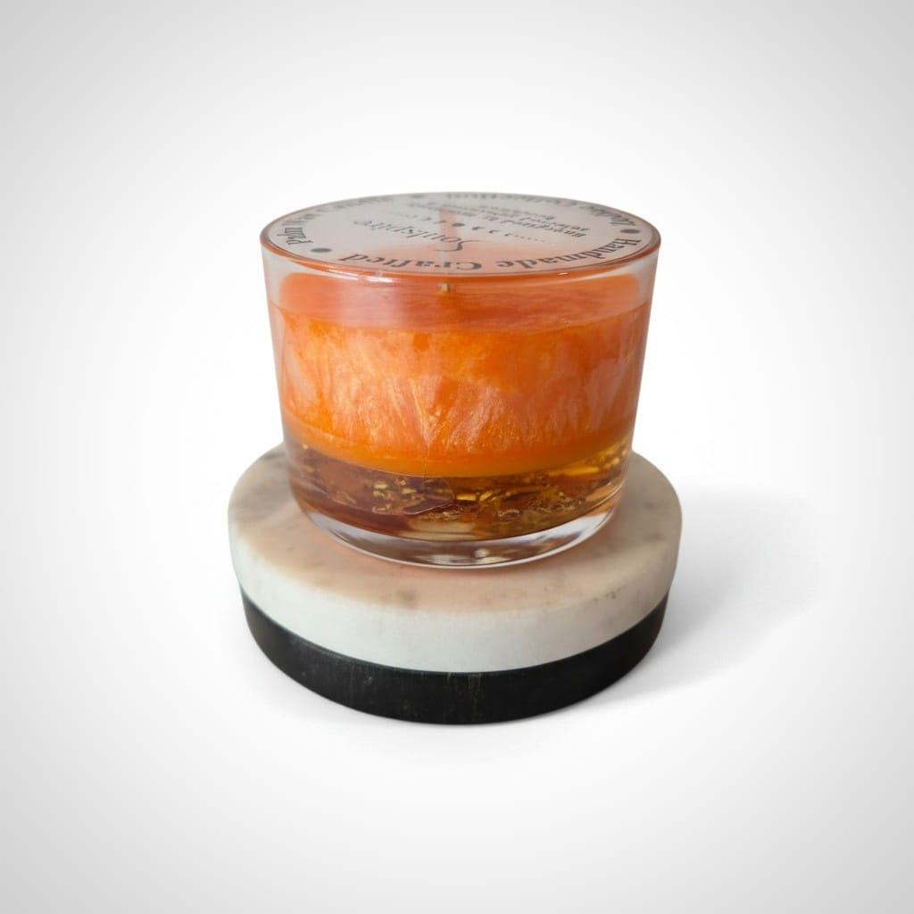 Above, a layer of palm wax carries vibrant orange tones and a carefully developed fragrance, guided by principles of chromotherapy and aromatherapy. Bright fruity notes blend with soft florals and gentle woody warmth, creating a scent that feels uplifting, expressive, and full of life. The result is a candle that feels radiant, empowering, and confidently alive, where creativity, warmth, and presence move in harmony.