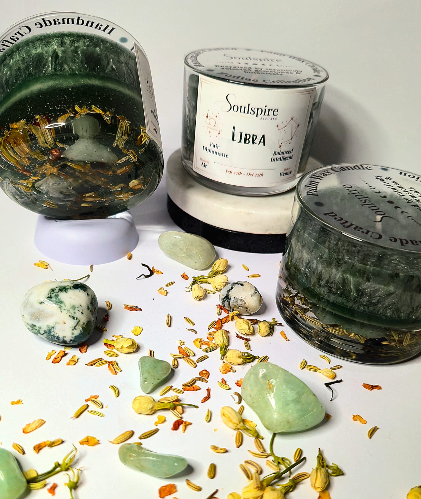 Created to reflect Libra's refined sense of balance and harmony, this candle embodies clarity, elegance, and thoughtful presence. The transparent jelly wax base reveals Green Aventurine, Moss Agate, and a gentle botanical blend of Fennel and Jasmine, allowing their energetic presence to remain visible throughout the burn. Together, these elements support emotional equilibrium, fairness, and calm decision-making, aligning with Libra's natural ability to seek beauty and balance in every experience.