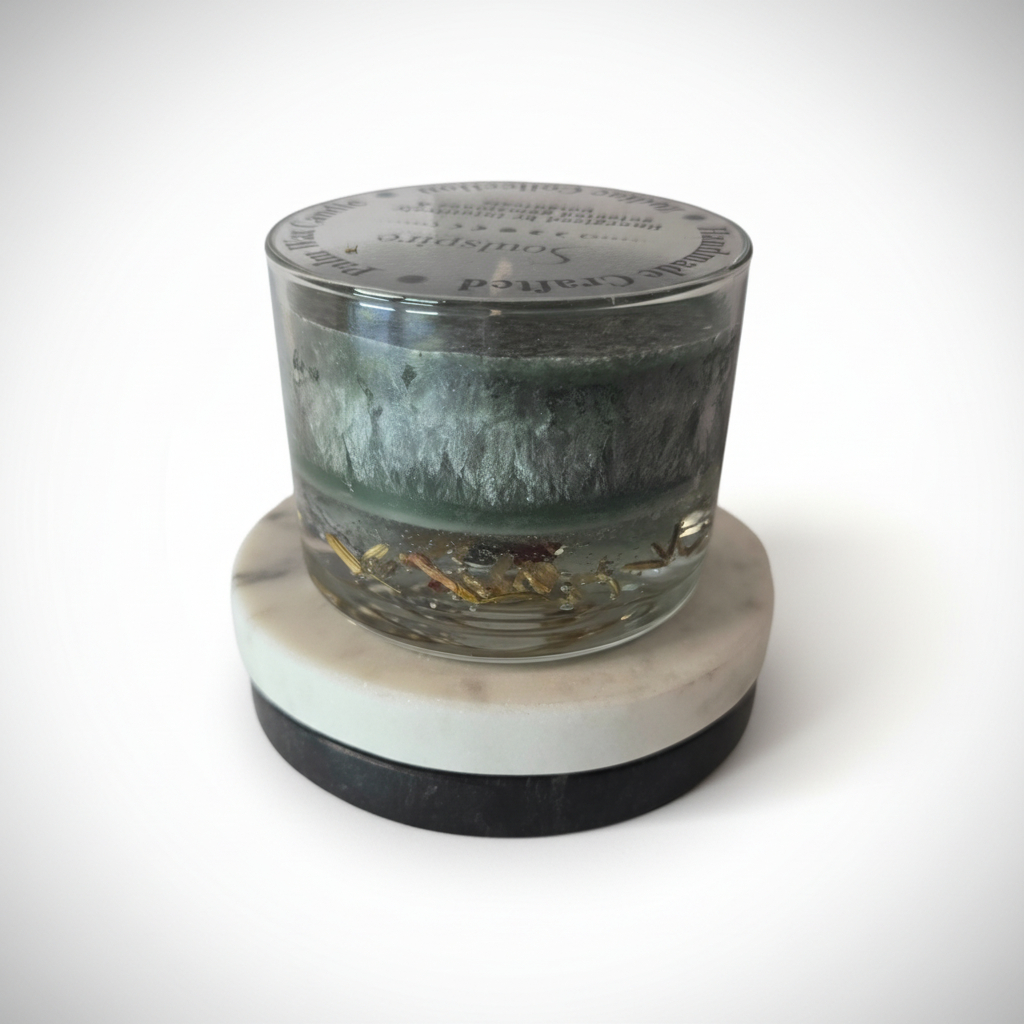 Above, a layer of palm wax carries dark green and black tones alongside a carefully developed fragrance, guided by principles of chromotherapy and aromatherapy. Fresh herbal and citrus notes blend with soft florals and warm musky undertones, creating a scent that feels sophisticated, grounding, and quietly harmonious. The result is a candle that feels balanced, elegant, and centered, where clarity, grace, and presence move in harmony.