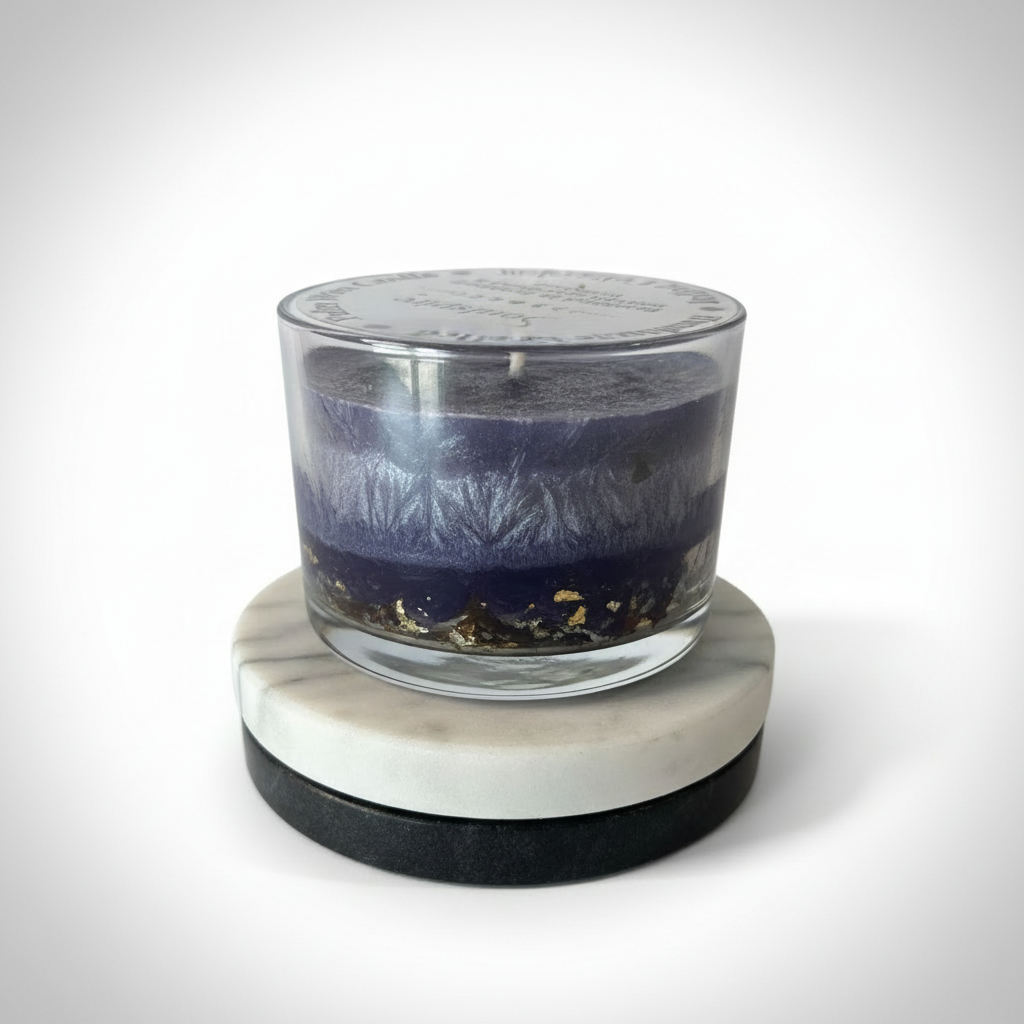 Above, a layer of palm wax carries deep blue tones alongside a carefully developed fragrance, guided by principles of chromotherapy and aromatherapy. Fresh citrus brightness blends with airy florals and soft woody warmth, creating a scent that feels uplifting, open, and endlessly dynamic. The result is a candle that feels expansive, energizing, and forward-moving, where curiosity, vision, and freedom exist in harmony.
