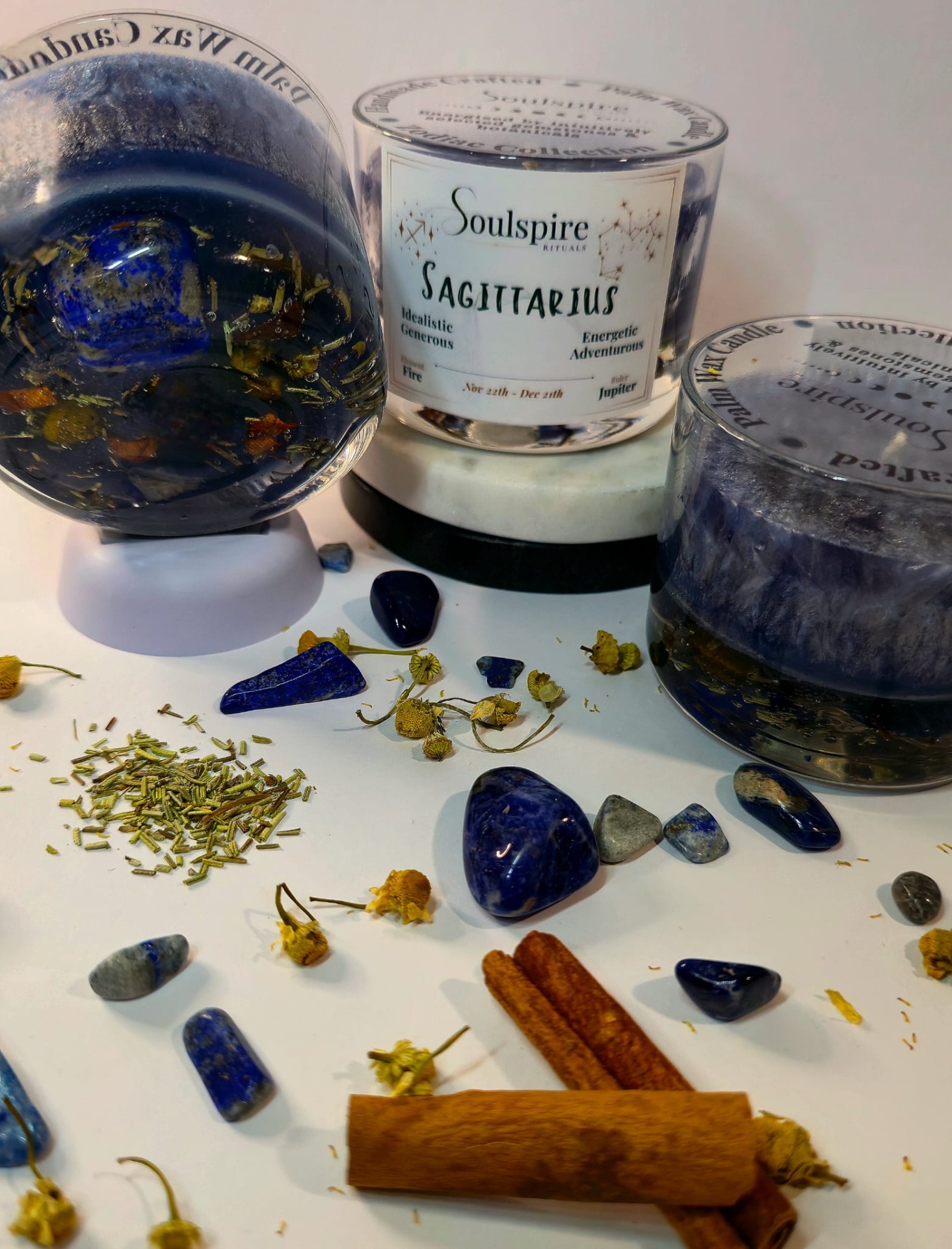 Created to reflect Sagittarius' adventurous and visionary spirit, this candle embodies freedom, curiosity, and inspired movement. The transparent jelly wax base reveals Lapis Lazuli, Sodalite, and a vibrant botanical blend of Cinnamon Sticks, Chamomile, and Rosemary, allowing their energetic presence to remain visible throughout the burn. Together, these elements support expansion, clarity, and optimistic energy, aligning with Sagittarius' naturally idealistic and generous nature.
