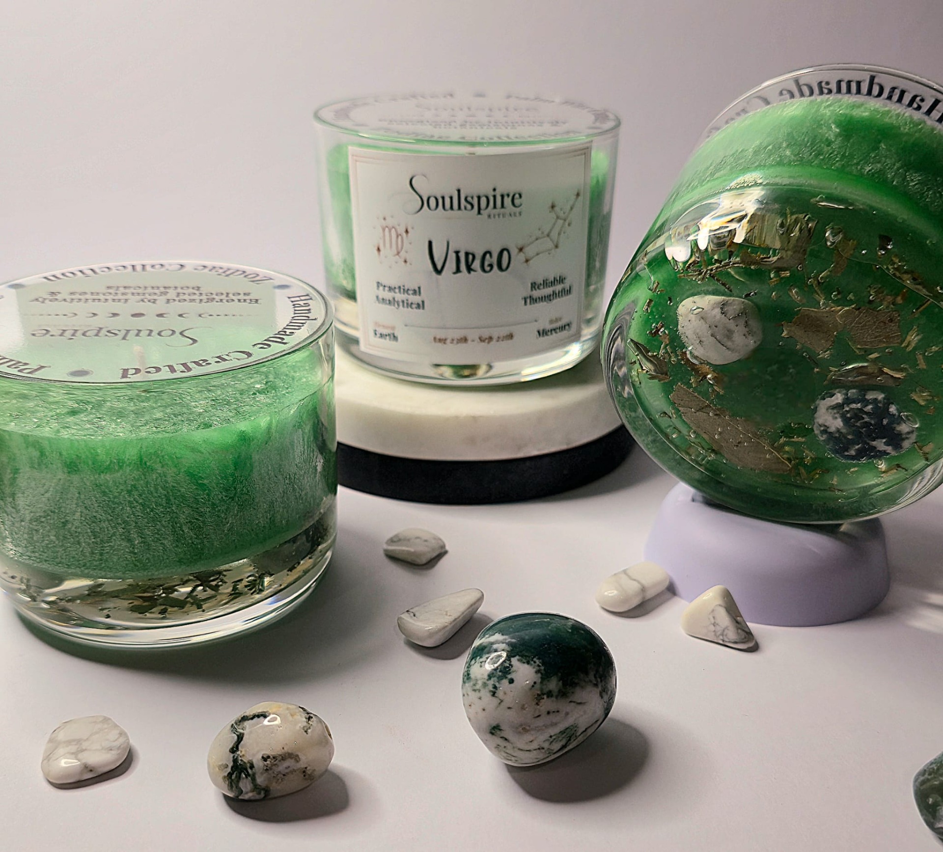 Created to reflect Virgo's thoughtful and grounded nature, this candle embodies clarity, balance, and mindful intention. The transparent jelly wax base reveals Howlite, Moss Agate, and a purifying botanical blend of White Sage, Eucalyptus, and Rosemary, allowing their energetic presence to remain visible throughout the burn. Together, these elements support calm focus, emotional balance, and steady reliability, aligning with Virgo's natural ability to refine, organize, and move with purpose.