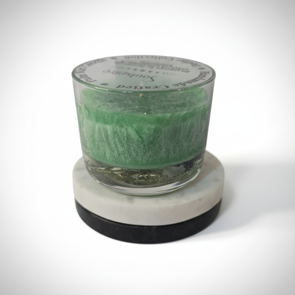 Above, a layer of palm wax carries soft mint tones alongside a carefully developed fragrance, guided by principles of chromotherapy and aromatherapy. Fresh citrus and delicate florals create a clean and uplifting atmosphere, while soft musky and woody undertones bring quiet grounding and comfort. The result is a candle that feels clear, balanced, and gently restorative, where precision, calmness, and presence exist in harmony.